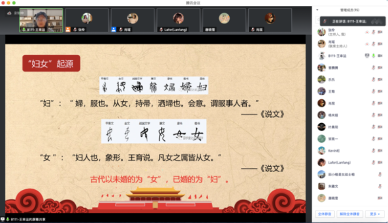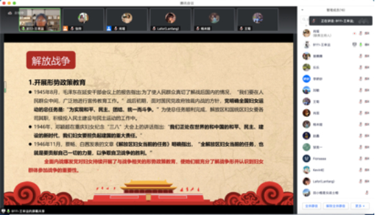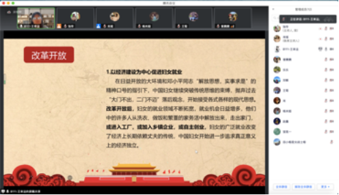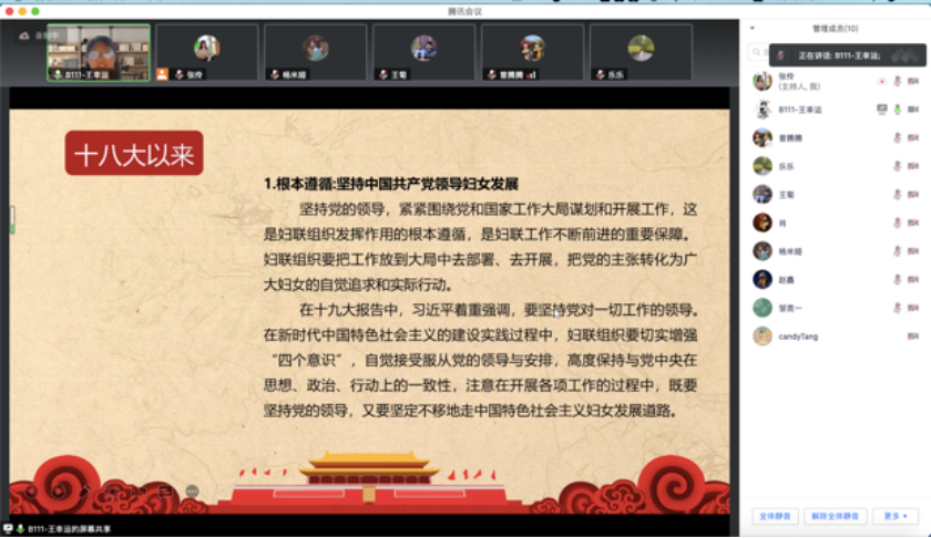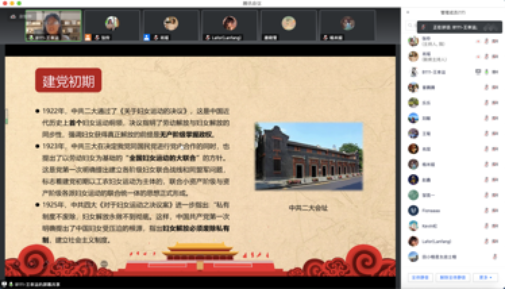 为庆祝建党100年,巩固深化“不忘初心、牢记使命”主题教育成果,开展党史学习教育,beat365亚洲体育官方网站2019级专硕第二党支部邀请马克思主义公司求索学社宣讲团成员开展主题宣讲。7月8日晚7点,马院求索学社宣讲团成员王幸运同学于腾讯会议平台为大家带来了一场题为《从“束缚”到“自由”——中国共产党书写妇女解放的伟大篇章》的主题宣讲,支部宣传委员张伶同志主持,支部党员同志、入党积极分子和班级同学共20人参与,本次宣讲持续了1小时15分钟。