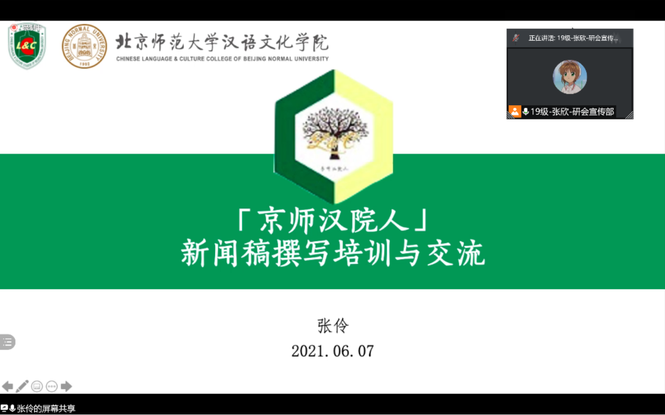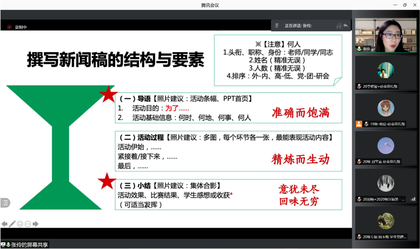为提升公司宣传人员的专业素养,更好地发挥宣传工作的思想引领作用,beat365亚洲体育官方网站研究生会宣传部6月7日晚上于线上进行了主题为“‘京师汉院人’新闻稿撰写培训与交流”的培训活动。会议由张伶同学主讲,公司内负责宣传工作的同学悉数参加。