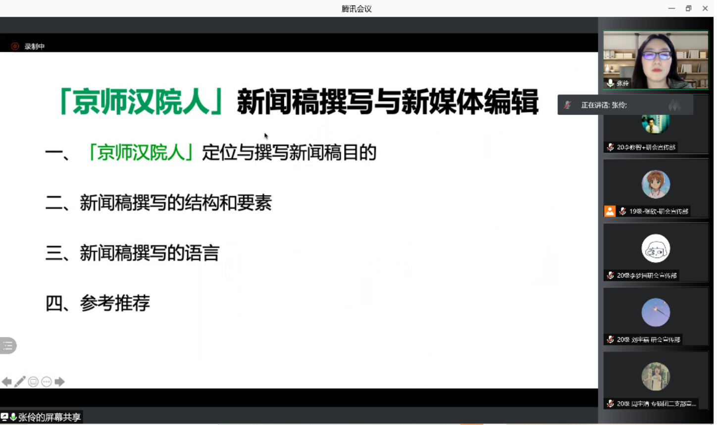 培训伊始,张伶同学首先向大家介绍了本次培训的主要内容,包括“京师汉院人”定位与撰写新闻稿目的、新闻稿撰写的结构和要素、新闻稿撰写的语言以及参考推荐四个方面。