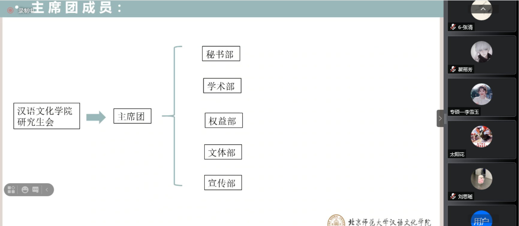 在研会招新与分部门介绍环节,主席团、秘书部、学术部、权益部、文体部、宣传部的成员依次就各部门的日常工作、成员构成和纳新要求进行了宣讲。