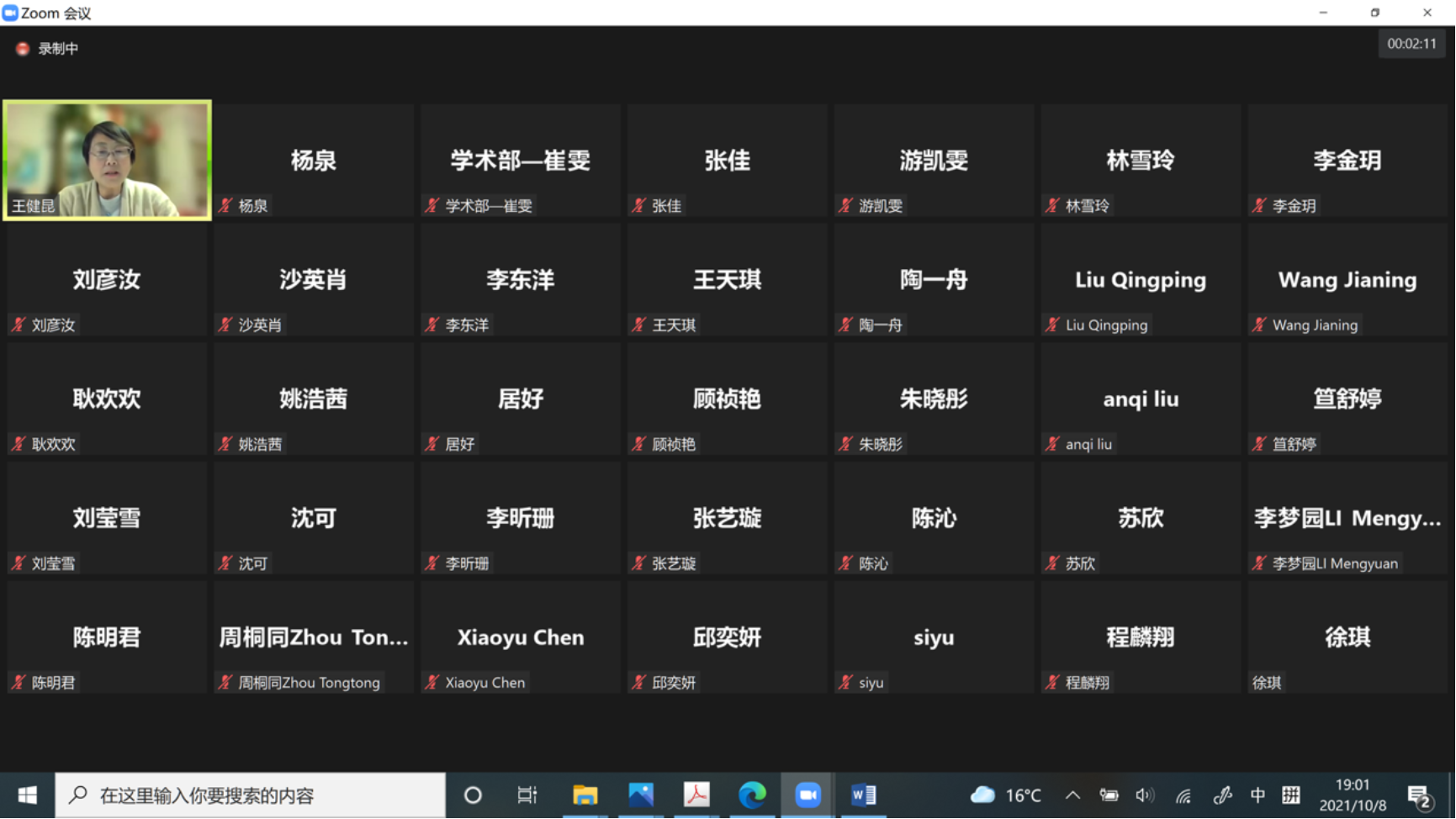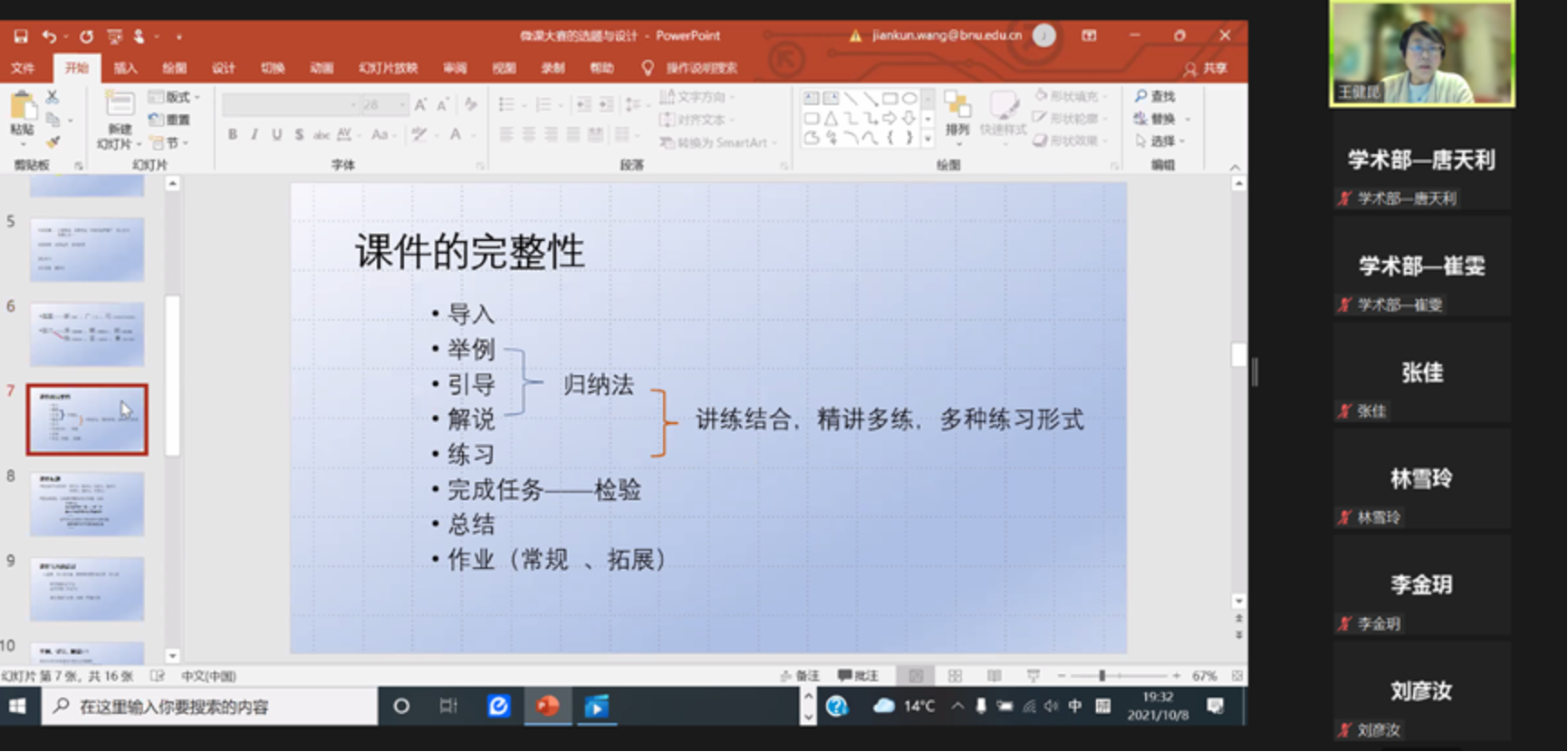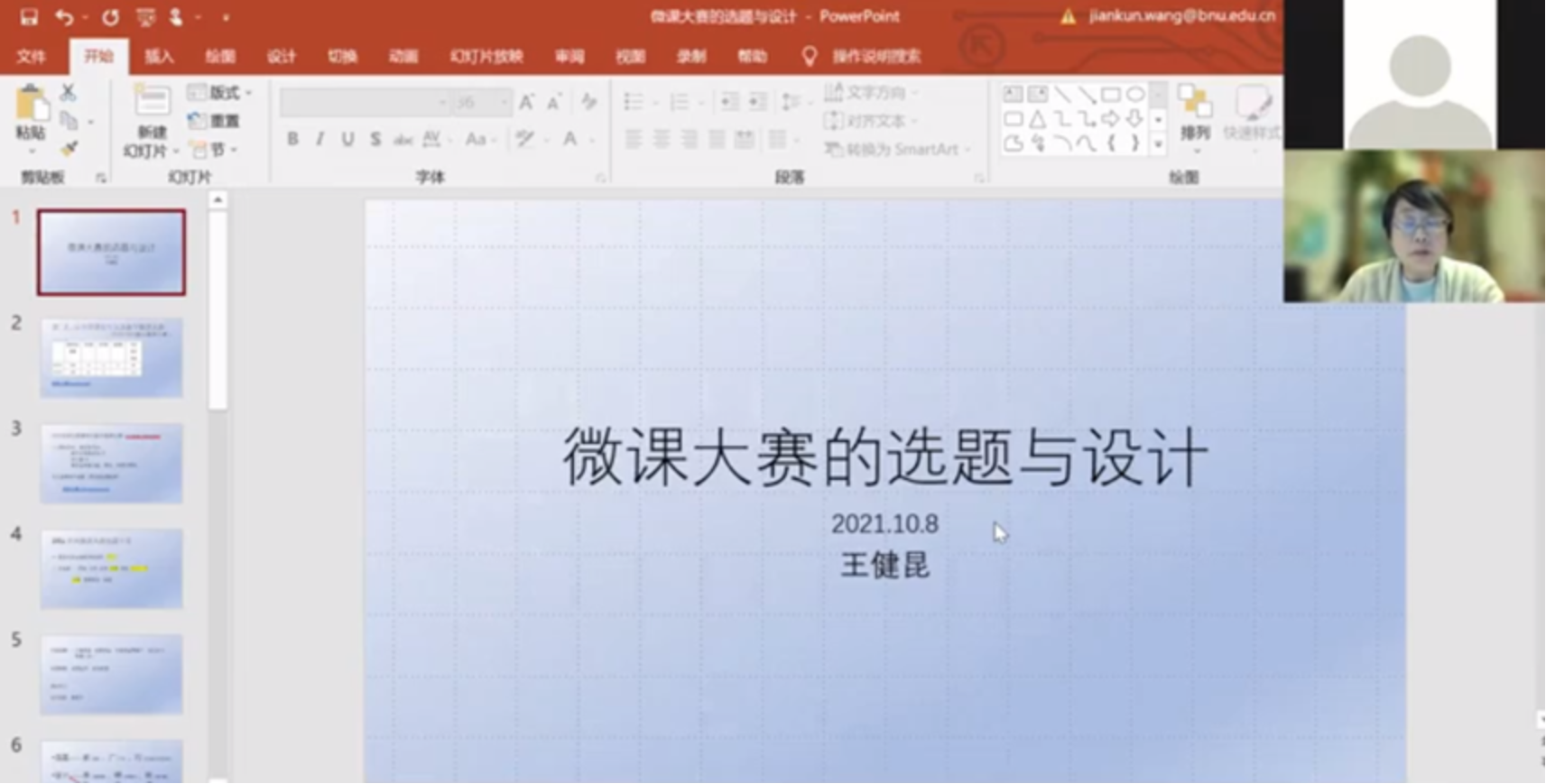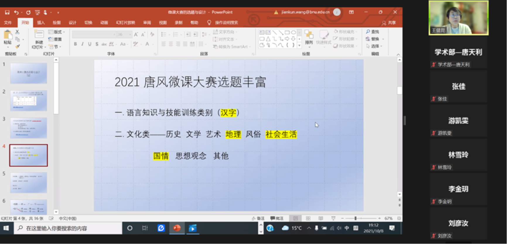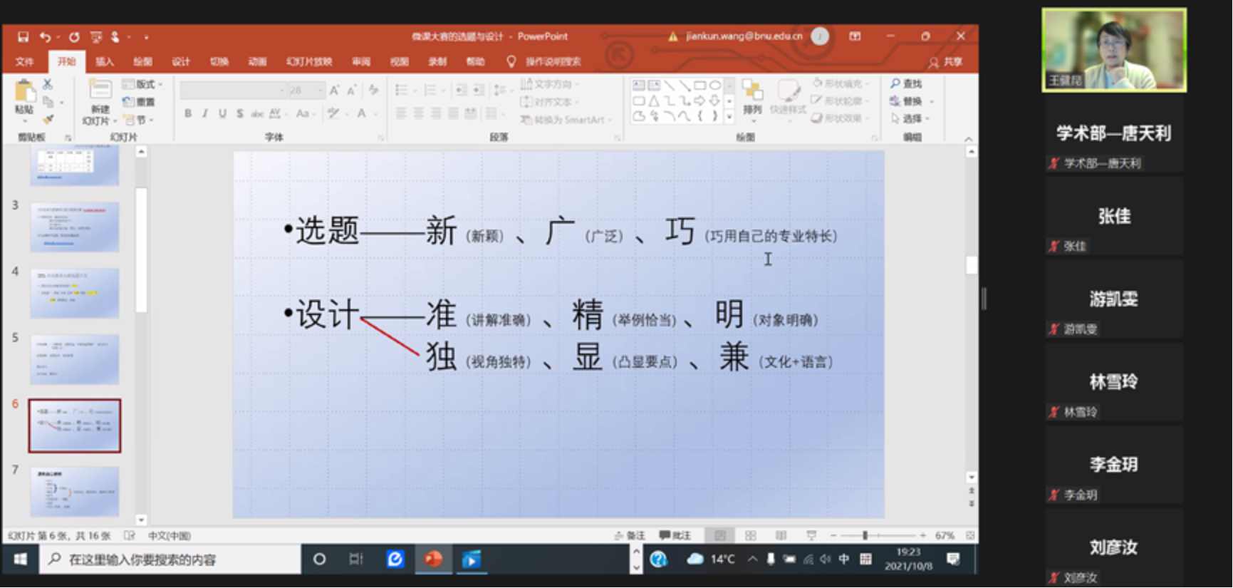 为全面提升同学们制作课件和教学的技能,帮助各位参加汉语教学微课大赛的选手们斩获佳绩,10月8日晚7点至9点,beat365亚洲体育官方网站以线上会议的形式举办了微课大赛选题与设计的赛前培训,王健昆老师作为主讲人为同学们提供了细致清晰的指导,四十多名同学积极参与了此次培训,获益匪浅。