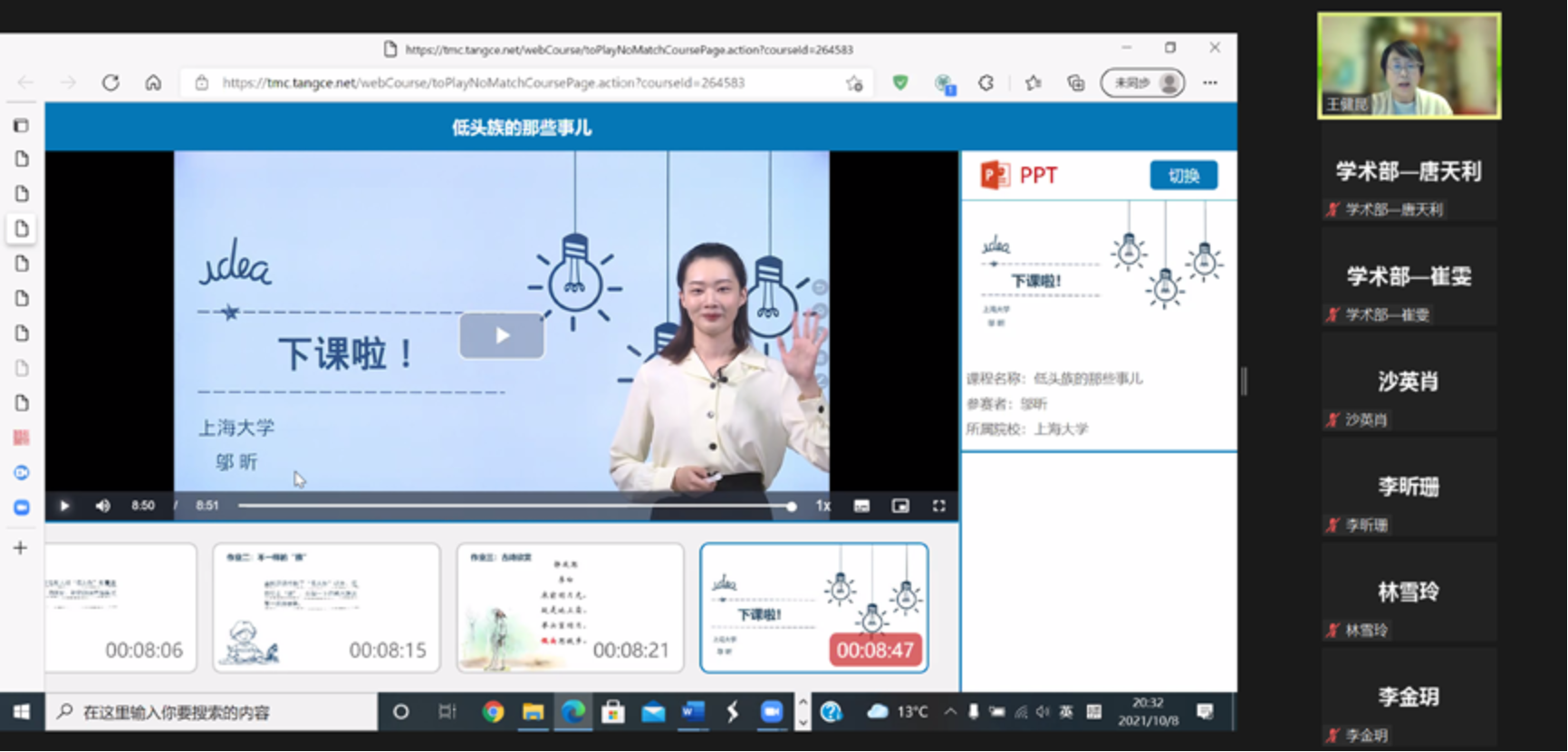 在讲解过程中,王老师多次举例并和我们一同观看了优秀获奖作品,如“可能补语”“低头族的那些事儿”“于老师的中国民歌小课堂”,感兴趣的同学可自行登录微课大赛官网查看。
