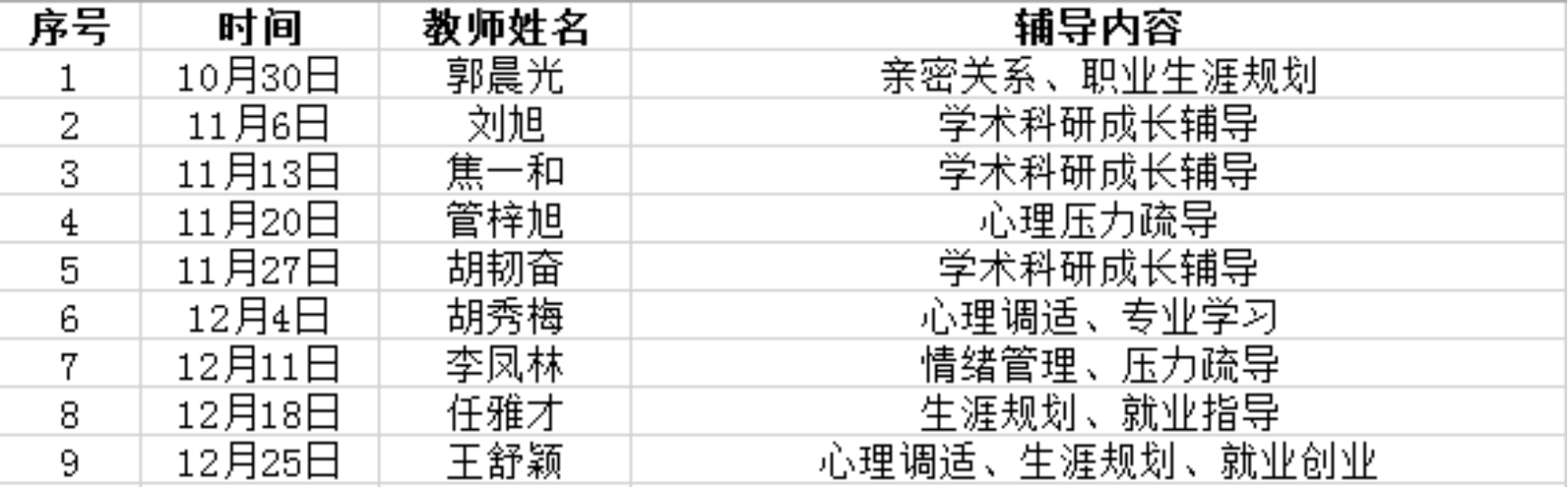 员工根据每位老师辅导主题内容及排班时间(见下图),通过预约邮箱1032919207@qq.com,在每周三下午申请预约,并说明个人信息及目前存在问题。