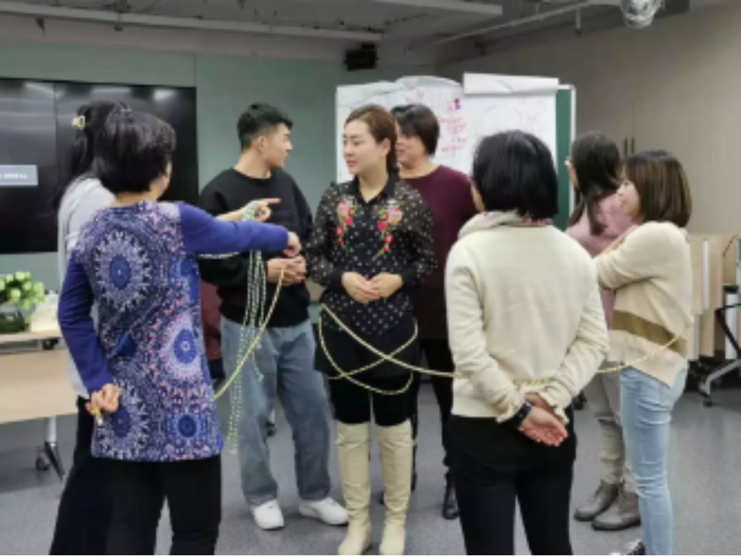 接着,老师进一步剖析了我们在与自己相处时,应当处理自己与自己内在的具体部分的关系:自己的渴望、观念、感受、行为、期待等等。在与自己相处时应当将这几个具体的部分相互剥离。为了更为直观地说明这一点,王老师将同学们分为2组,让大家分别扮演“自己”、“渴望”、“观念”、“感受”、“行为”、“期待”这6种角色,绳索的捆绑代表关系。在体验中同学们有了更深刻的理解。