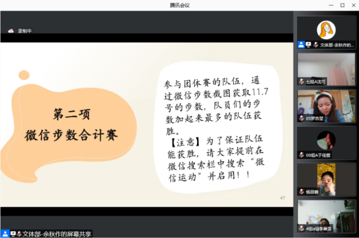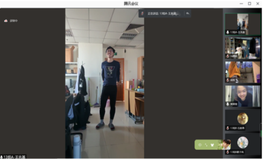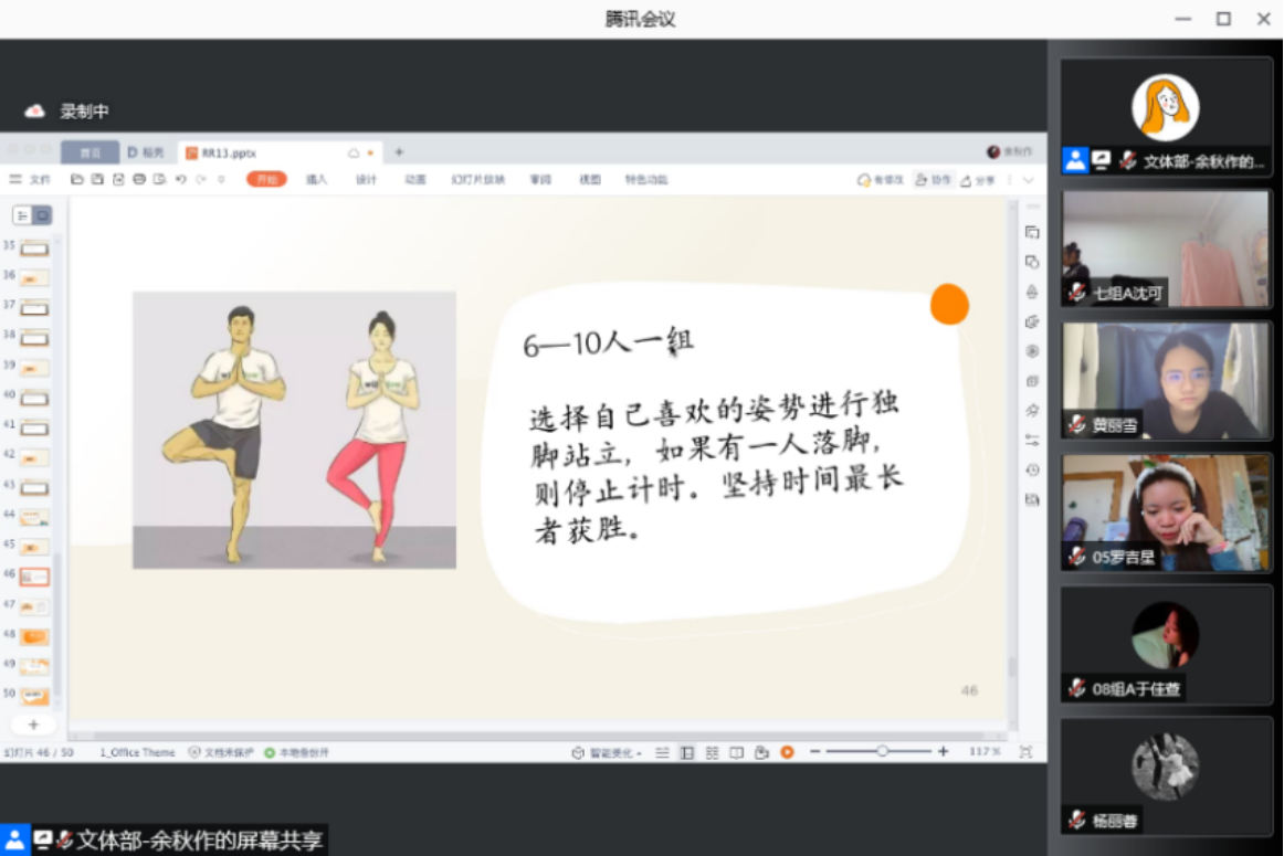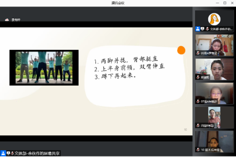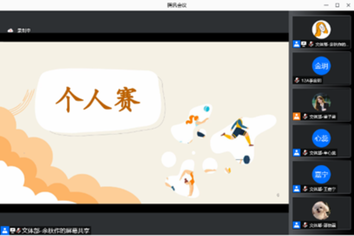 个人赛共分为四个环节:一分钟开合跳竞赛、一分钟举臂蹲起竞赛、一分钟交替摸脚挑战赛和“冬奥知识猜猜猜”。前三个环节为体力环节,在观看完规范动作的教学视频后,每一位参赛者打开摄像头计时一分钟,由组内成员分别计数,组长记录结果。