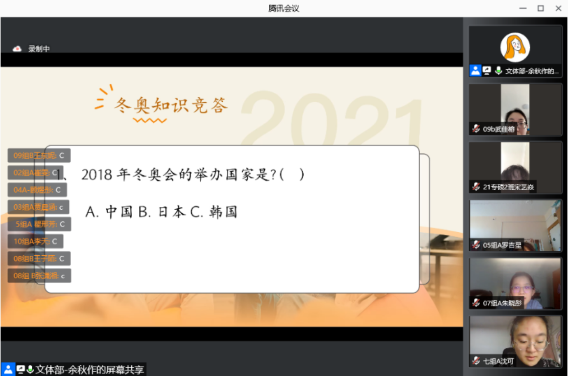 个人赛第四个项目为脑力环节。项目组用PPT展示冬奥会比赛项目知识,全体同学在评论区抢答,前三位回答正确的同学积一分,累计得分最高的人获胜。
