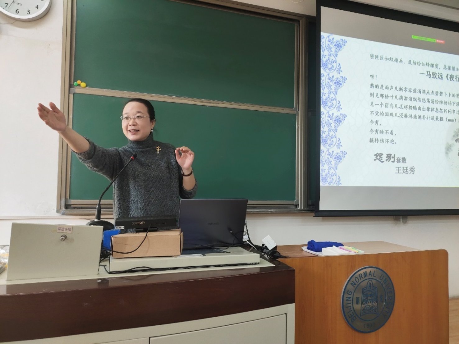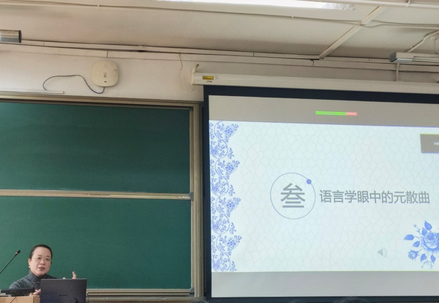 首先,汪老师从中国古典韵文自身的成长和我们需要具备的教学储备两个方面讲解了我们为什么要了解元曲。她指出,中国古典韵文是一个不断在变化的系列,元散曲广泛吸纳了少数民族音乐和唐诗宋词的特点,体现着当时多元文化融合的特色与蒙元帝国的发展样貌,在中国古典文学中占据着重要地位。此外,我们将来作为汉语国际教师,也需要相应的教学储备,以更好地教授和传播中华文化。