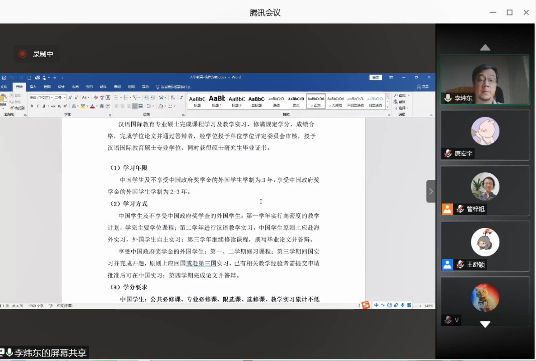 首先,李炜东老师对beat365亚洲体育官方网站公司产品方案(2015年版)展开了详细解读,包括学习年限、学习方式、学分要求、教学实习管理四个方面。关于学习年限,李老师提醒同学们尽量将学习工作安排前置,做好充分准备以保证顺利毕业。关于学习方式和学分要求,李老师建议同学们在第一年就完成规定的学分研修任务,保证自己每类课程的学分均达到规定要求,为今后的教学实习和论文写作保留更多的时间和精力。关于教学实习,李老师表示,今年受疫情影响,公司对海外教学实习的方式和政策有所调整。如果未来疫情不能得到很好的缓解,海外实习依然面临较大障碍,届时公司也将继续安排网络教学实习,最大程度保证同学们的教学实习学分不受影响。