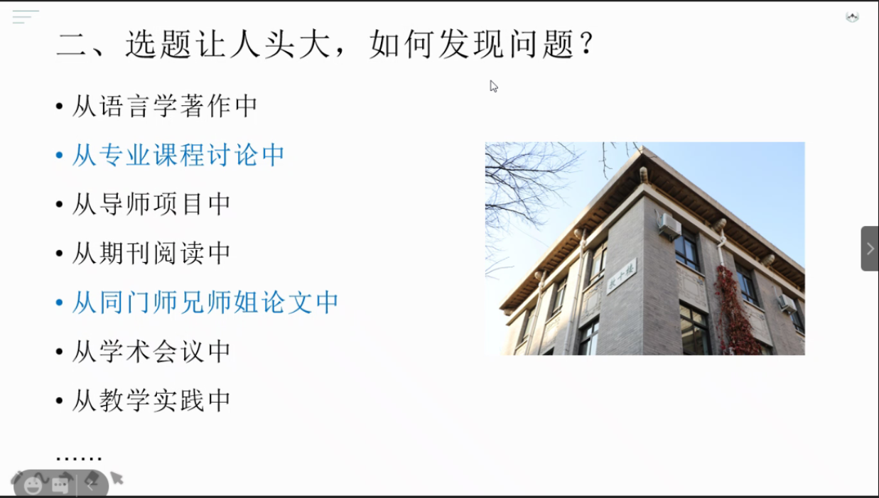 牛慧鑫师兄从选题和定题两个角度切入介绍了他的论文研究心得。师兄将方法指导与实例相结合,生动指明了选题的四大途径,比如文献阅读这一途径具体可以通过追问为什么、抓住未被关注的细节、以组会为平台借助导师力量来实现。随后,师兄又从写作过程、开题以后两方面对师弟师妹们提出很多详尽的方法。例如,他以自己的毕业论文开题报告为案例,指出每个研究子类综述的具体写法应该为:总述研究方面——指出代表学者——介绍重要文献的内容——精简的评述,注意不要使用武断性副词等。