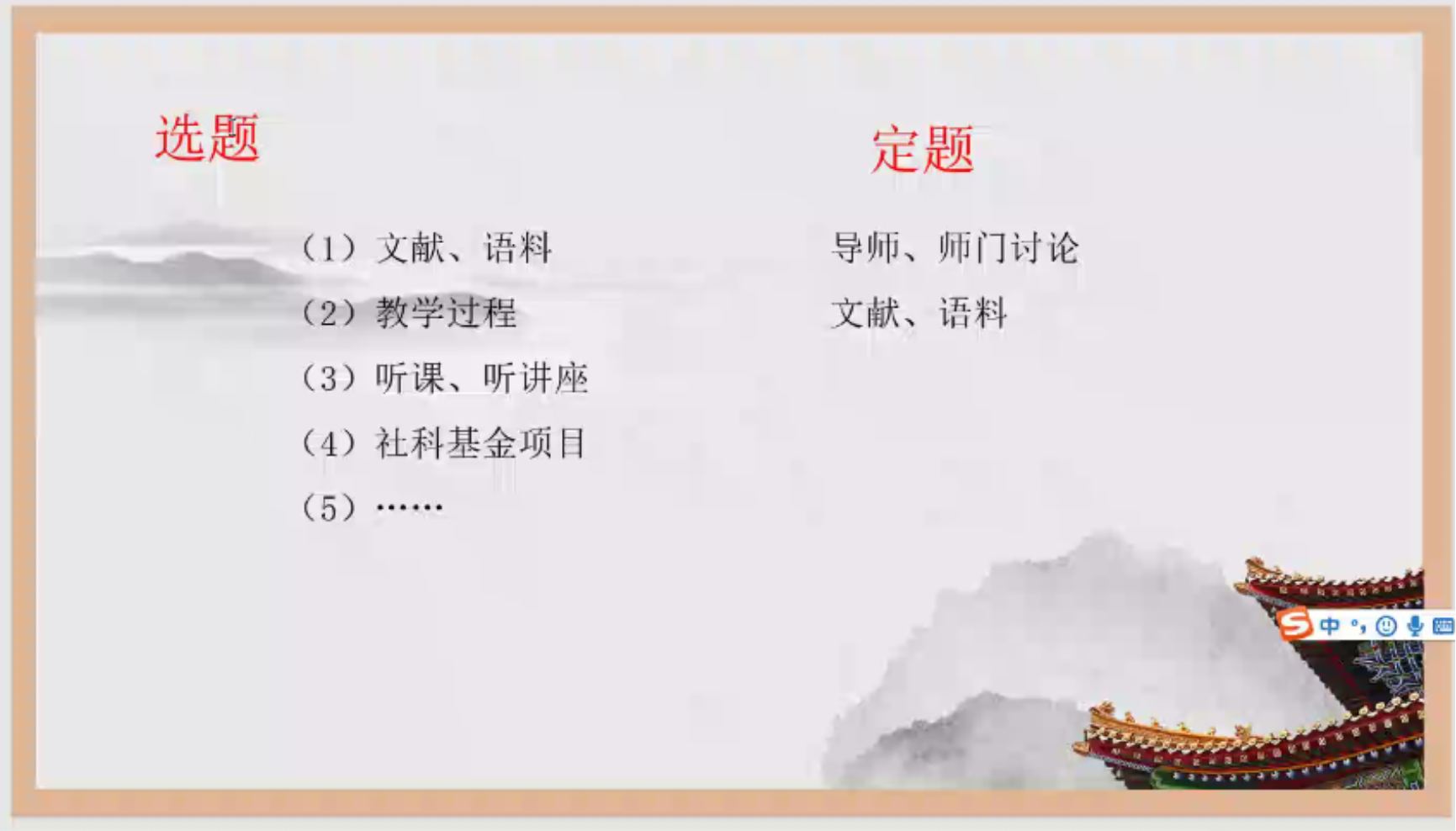 肖慧敏师姐在开篇中指出,开题报告实质是对自己现阶段研究的落实情况的一个汇报,有别于毕业论文,但与毕业论文的质量直接相关。随后,从目标原则、如何准备开题、如何撰写开题报告三个方面进行了分享。师姐在分享中提出很多创见,例如:在第一部分中指出开题报告是寻求老师指导的重要时机,因此应当在形式、思路上不出错,才能获取更多有价值的帮助;在第二部分中指出选题是一个贯穿整个论文撰写的过程,会在写作研究中不断调整;在第三部分中指出实证性研究的开题从研究方案切入比较高效,文献综述撰写应当将答辩老师定位为读者、注重导向自己的研究等。