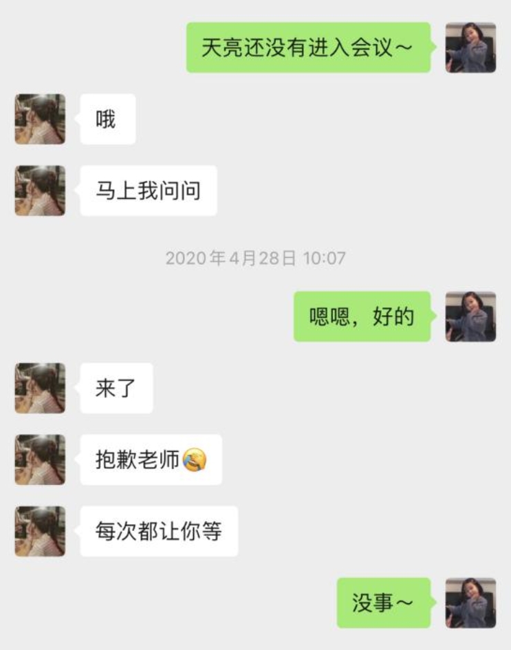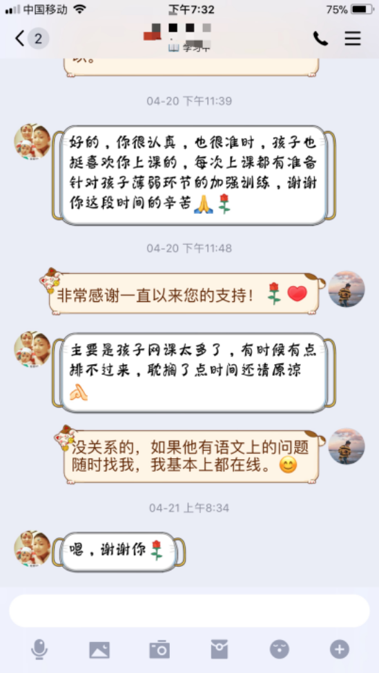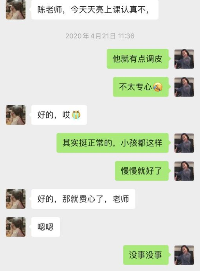陈旭瑶说:“员工的父母工作较忙,辅导时父母都在上班,家里只有姥姥和员工,有一次上课,员工迟迟没有进入会议,我就联系了员工家长,原来是设备出现了一些问题,但孩子和姥姥都无法解决。后来问题解决了,视频会议接通了,姥姥连忙解释并不停的表示抱歉,当时我心里特别暖,就感觉特别受到家长的尊重与重视,感觉无论怎样的付出都是值得的!”