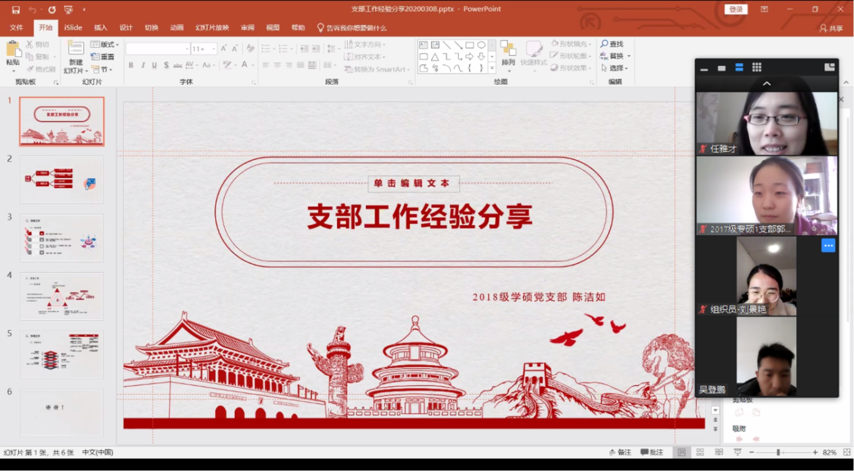 接着,2018级学硕党支部书记陈洁如向大家分享了支部工作经验。她介绍了这学期支部工作的变化,即进行一段时间的线上工作。在这样的情势下,支部内部的协作、支部和党委的交接等工作都面临着挑战,也更需要大家密切配合、团结协作。另外,她就党员发展工作规范、党建系统信息更新、党员发展材料审核等相关环节分享了经验。她认为让申请入党的同学熟悉入党流程、加强沟通,可以有效提高党员发展工作的效率。最后,她建议各支部整合资源,开展跨公司、跨支部的党建活动,以促进共同学习和进步。