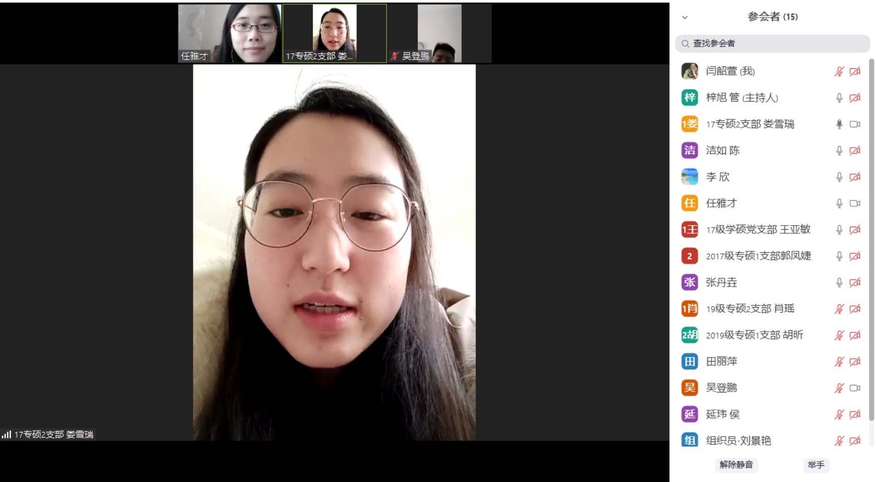 首先,管梓旭老师介绍了这次线上支书会召开的背景和目的,传达了公司、公司有关疫情防控工作的工作要求和重要部署,要求党员在遵守各项防疫规定的同时,不造谣不传谣,发挥党员模范带头作用;在确保生命安全和身体健康的前提下,规划好自己的学习生活,不断提升自己,不虚度光阴。接着,管梓旭老师结合当前疫情发展形势,就本学期的党员发展与教育培养、微党课比赛、党建基金活动进行了具体部署。她提醒大家注意党员发展流程中的操作细节,叮嘱各支书密切关注所在支部的积极分子培训、发展对象共训班、预备党员线上转正等情况,并指出在所有的发展节点都要线上、线下同时开展工作,以确保各个支部的工作顺利开展。她鼓励各支部充分利用“学习强国”等学习资源,结合专业特色和员工兴趣,开展“三会一课”和党建工作。管梓旭老师还就微党课工作进行了部署,她建议大家在选题上多下功夫,结合当下疫情形势,立足专业优势,争创佳绩。