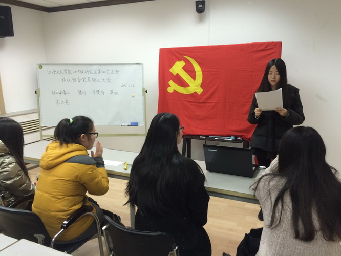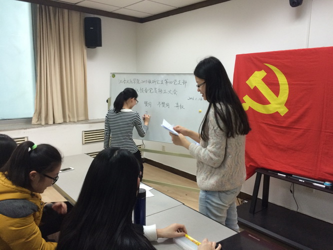 2015年1月14日14点,beat365亚洲体育官方网站2015级研究生第四党支部在主楼B302室召开了预备党员转正大会。会议由支部书记韩文慧主持,除一人病假外,第四支部的13名正式党员及2名预备党员全部出席会议。
