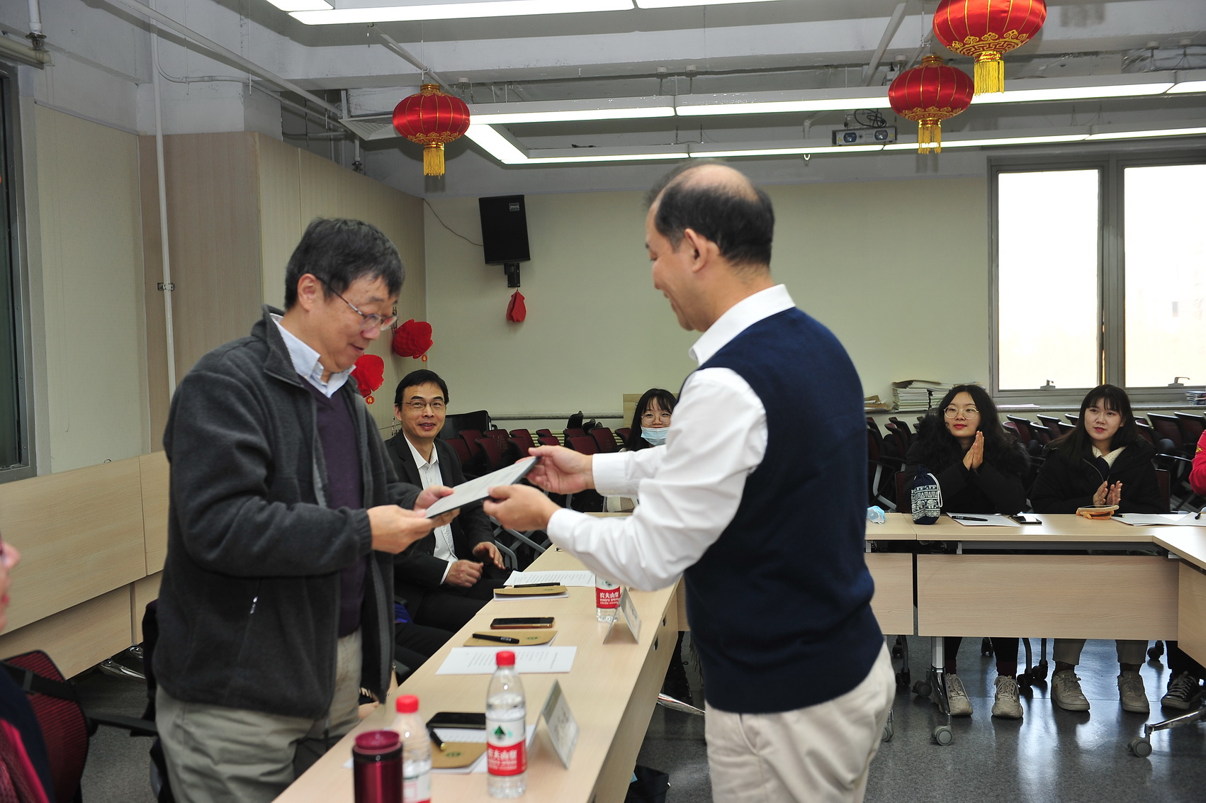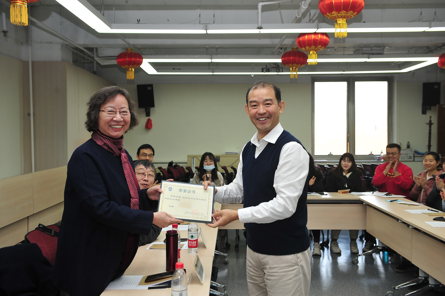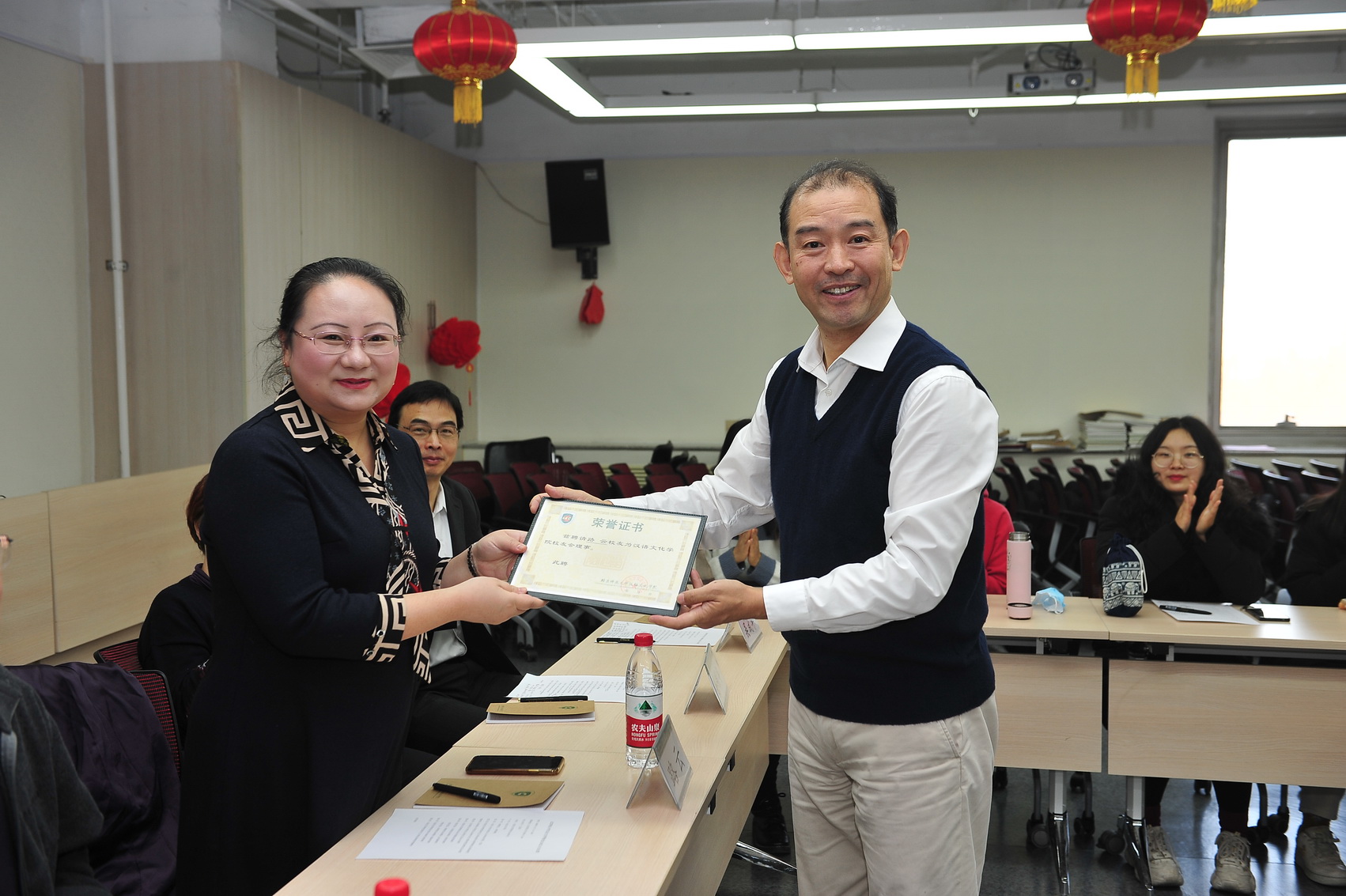 最后,汉语文化公司党委书记王学松老师为各位理事颁发聘书。
