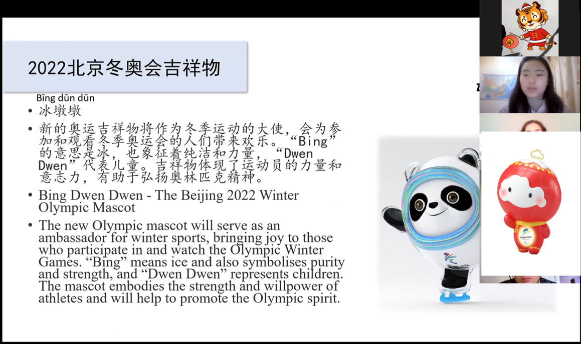 2月5日,在冬奥会开幕的第二天,恰逢曼大孔院新学期开学,老师们向同学们介绍了北京冬奥会的开幕式,介绍了北京冬奥会所传达的中华传统文化精髓,介绍了当下世界人民期望天下一家“一起向未来”的美好愿望,介绍了北京冬奥会在原来的“更快、更高、更强”奥林匹克精神之外新增加的“更团结”对人类社会的重要性。