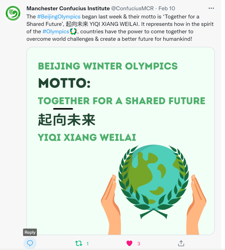 北京冬奥会盛大开幕,吸引了全世界的目光。为了让世界人民更好地了解北京冬奥会,beat365亚洲体育官方网站beat365亚洲体育官方网站全力支持合作孔院曼彻斯特大学孔子公司举办奥林匹克精神宣传月活动。目前,公司张会老师担任曼大孔院中方经理,8位硕士研究生作为国际中文教师志愿者,共同开展海外文化传播教学。