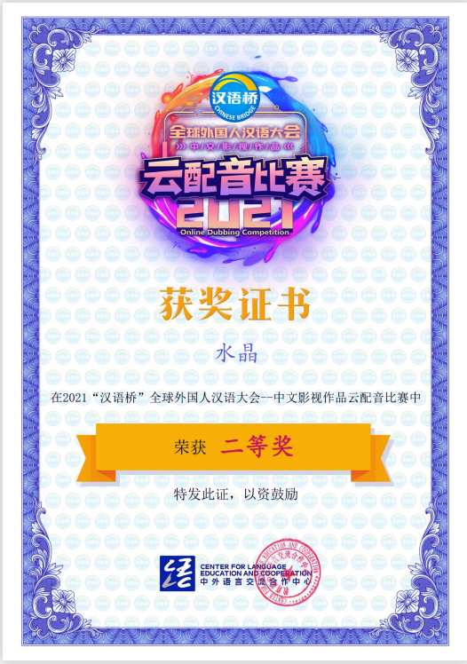 汉语大会——中文影视作品云配音比赛二等奖