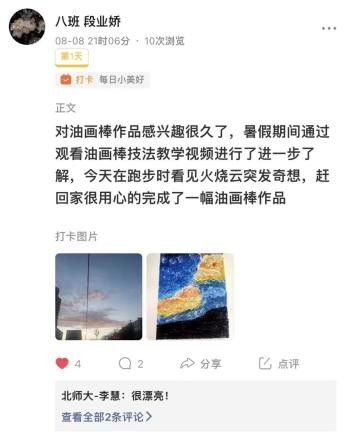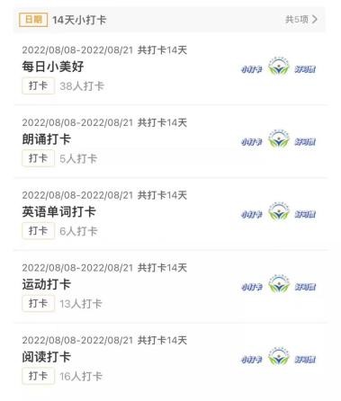 在课堂之外,实践队员们还别出心裁地设置了“14天小打卡”活动,鼓励同学们记录并分享暑假的精彩片段,通过打卡的形式养成良好的学习及生活习惯。打卡小程序共设置了“每日小美好”“朗诵打卡”“英语单词打卡”“运动打卡”“阅读打卡”五个小板块,内容涵盖学习、运动、生活各个方面,由员工们自主选择一个或多个板块进行打卡。员工们积极参与,十分热情。以打卡小程序为平台,将师生互动延伸到课外,更大程度上增进了师生之间的相互了解。