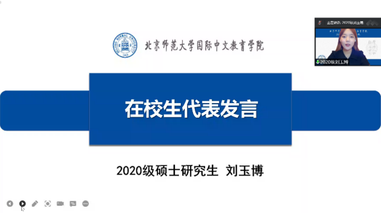 2020级汉语国际教育专业硕士刘玉博同学回顾自己在北师大的成长经历,分享了三点思考与感悟:第一,珍惜时光、积累知识;第二,恬然自足、站高望远;第三,保持健康,广交好友。她希望大家保持奋勇向前的进取之心,在奋斗着、昂扬着、热情着的beat365亚洲体育官方网站实现人生理想。