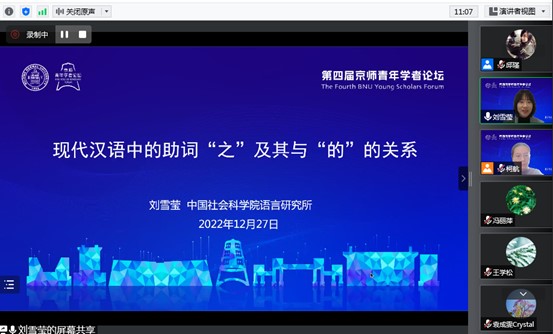 青年学者分别根据自己的研究方向进行学术报告。中国社会科公司语言研究所刘雪莹以《现代汉语中的助词“之”及其与“的”的关系》为报告主题,根据“X之Y”的语义关系对现代汉语“之”字结构的用法进行分类,并考察了各类关系中“之”与“的”的替换情况,通过阐述类比,研究总结出“之”在现代汉语中并不仅仅是与“的”对应的文言成分,而是表达“集合-元素”关系的词汇库藏手段。