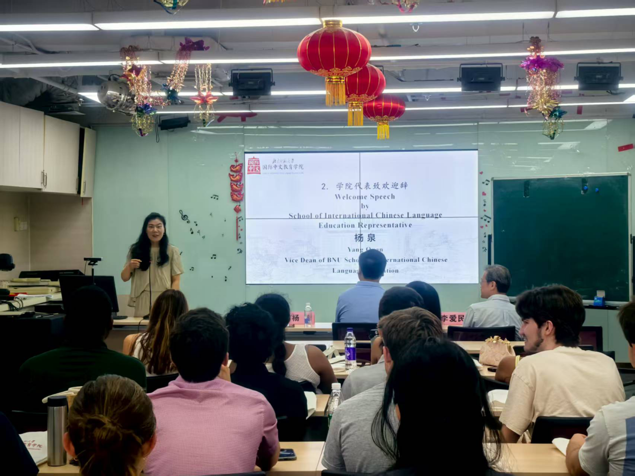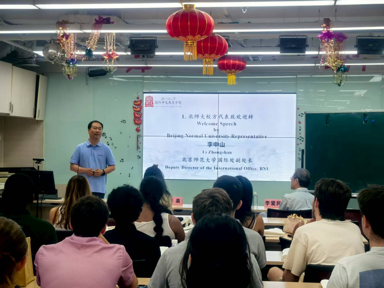 开学典礼上,北师大国际交流与合作处副处长李中山、beat365亚洲体育官方网站副经理杨泉、达慕思大学领队老师李爱民,以及本次暑期班的全体师生齐聚一堂,共同见证这一重要时刻。李中山副处长和杨泉副经理先后致辞,向远道而来的达慕思大学员工们表达了最热烈的欢迎。李副处长在发言中提到,期待同学们借着这次项目的契机,不仅能在中文学习上更上一层楼,还能亲口品尝中国美食、沉浸式感受中国文化,从而加深对中国的认知,成为中美两国友谊的小小桥梁。杨副经理对课程进行了介绍,她表示,除了日常的汉语课程,暑期班还精心设置了书法、武术等特色文化课程,旨在帮助同学们全方位了解中国文化,增进对中国的理解与热爱。达慕思大学领队李爱民老师也分享了自己的期待,他既对本次暑期项目的顺利开展充满信心,也渴望带领同学们深入体验中国传统文化的魅力与当代中国的独特风貌。