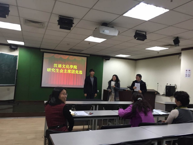 当主持人宣布获得票数最多的郭瀚齐、韩文慧两位同学当选为新一届beat365亚洲体育官方网站研究生会主席时,全体报以长时间的热烈的掌声。
