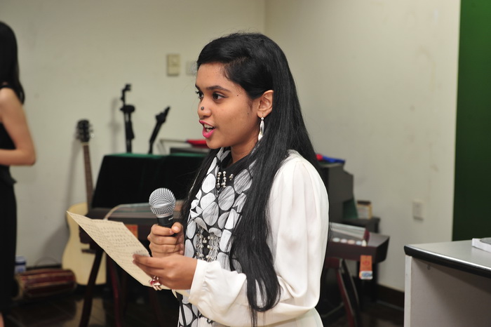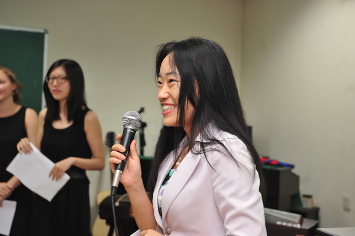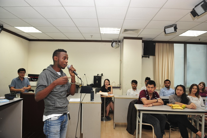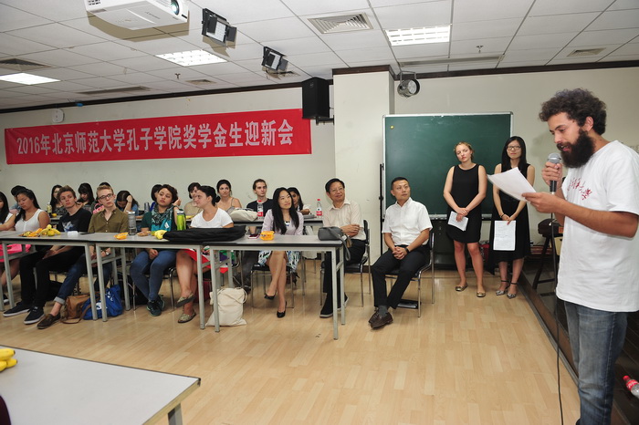 几位领导、老师讲话之后,来自孟加拉国的本科一年级员工冉佳、来自尼泊尔的博士新生古马尔、来自匈牙利的硕士生高迪和来自肯尼亚的语言进修生丹尼斯依次上台发言,与同学们分享自己来北京学习的期望与体会。冉佳已在北师大学习过一年汉语,她认为这里的老师非常友好、耐心和努力,让她很快克服了一开始的不适应;古马尔表示自己来华学习是要实现自己的中国梦,并进一步帮助更多的尼泊尔人实现他们的梦想,为“一带一路”战略贡献自己的一份力量;高迪觉得自己从孔子公司得到的太多,而将亲身领悟到的中国文化分享给世界,则是她回报的方式;丹尼斯在父亲的鼓励下决定为未来的事业学习汉语,从一窍不通到初识门庭,他付出了许多努力,并将在老师们的帮助下坚持学习,力求进一步的突破。
