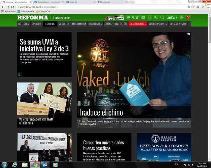2014年的秋天,从墨西哥来到beat365亚洲体育官方网站beat365亚洲体育官方网站攻读汉语言专业本科的Alonso Coronado(陆子龙)在学习中领略到中国现代文学作品独特的魅力。因为想与同胞一同分享对中国现代文学的热爱,决定承担一项对一个本科生而言艰巨而又愉快的任务——翻译出版墨西哥第一部中国现代文学短篇小说选集。一年多以后,历经艰辛、伴有无数教授之助的努力终于结出果实——Antología Breve del Cuento Moderno Chino(《中国现代短篇小说选集》)于2015年10月在墨西哥城出版。该书的出版对帮助墨西哥读者了解中国文学及社会历史文化、促进中墨文化交流具有积极意义。