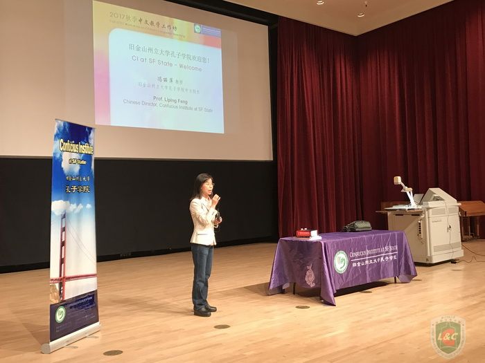 旧金山州大孔子公司中方经理冯丽萍教授首先代表孔院向参加工作坊的老师们表示欢迎,她介绍了孔院近期的活动,希望能与当地中文教师增进交流与合作。 冯教授还与大家分享了旧金山州立大学孔子公司下属孔子课堂西塞拉中学员工黄秋月刚刚荣获第十届“汉语桥”世界中员工中文比赛总冠军的喜讯,在场的中文教师纷纷鼓掌庆祝北加州中文教学再结硕果。