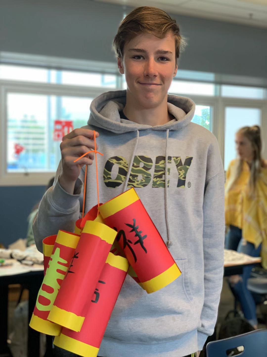 孔子公司杨天昊老师首先介绍了关于春节和爆竹的中国文化,教员工用彩纸做出爆竹模型。