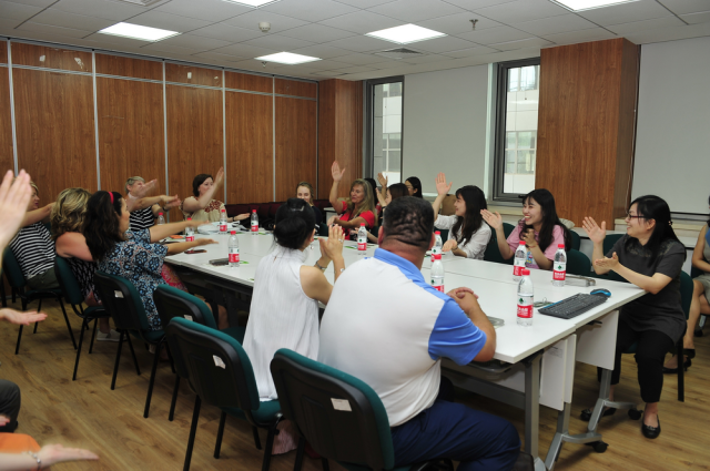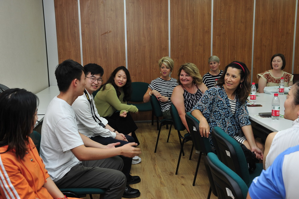 最后,即将前往俄大孔院各个教学点工作的汉院员工们与访问团的老师们就在俄州的教学和生活方面进行交流,访问团的老师们给予这些即将赴任的汉语志愿者教师很多宝贵的意见。访问团的老师们也很珍惜这次交流机会,纷纷与这些新汉语志愿者教师合影留念。