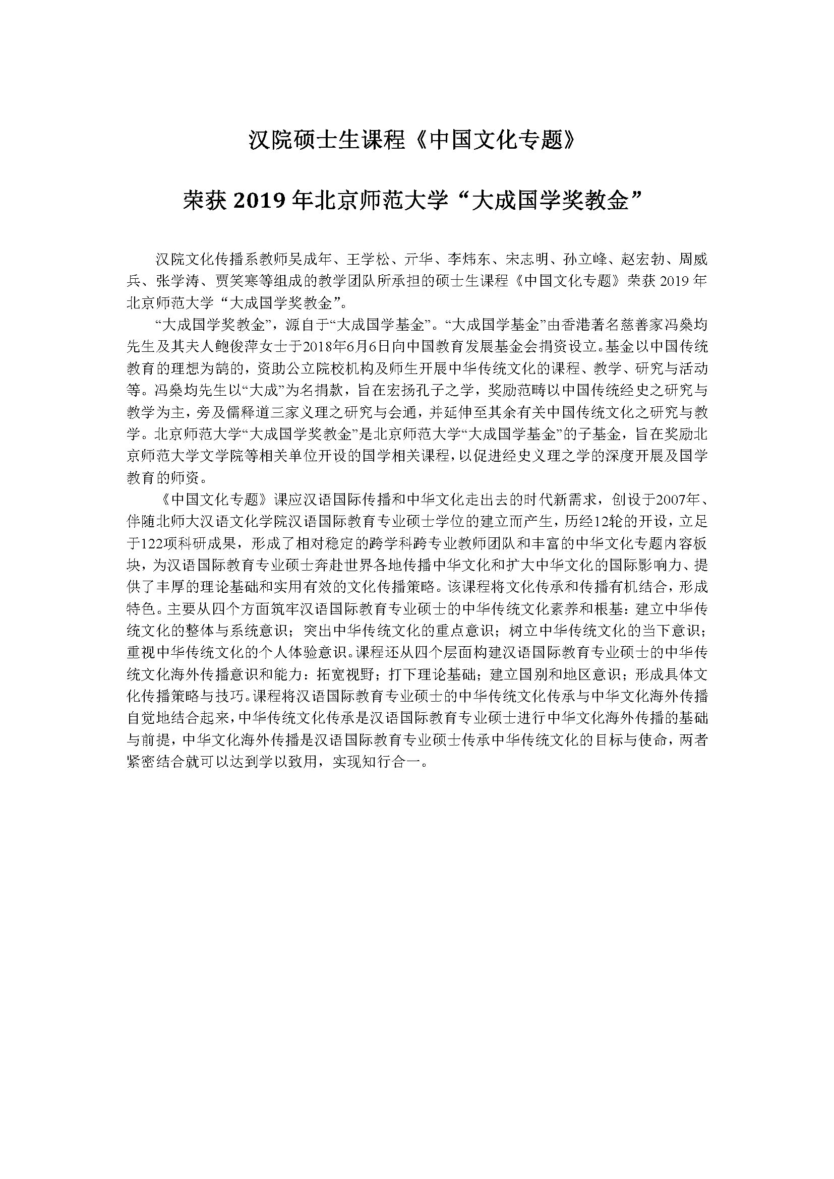汉院文化传播系教师吴成年、王学松、亓华、李炜东、宋志明、孙立峰、赵宏勃、周威兵、张学涛、贾笑寒等组成的教学团队所承担的硕士生课程《中国文化专题》荣获2019年beat365亚洲体育官方网站“大成国学奖教金”。