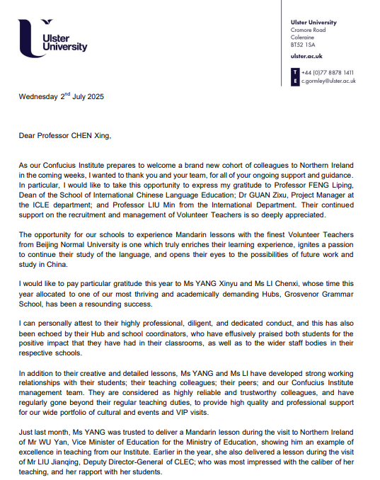 奥斯特大学来信致谢北师大国际中文教育工作
