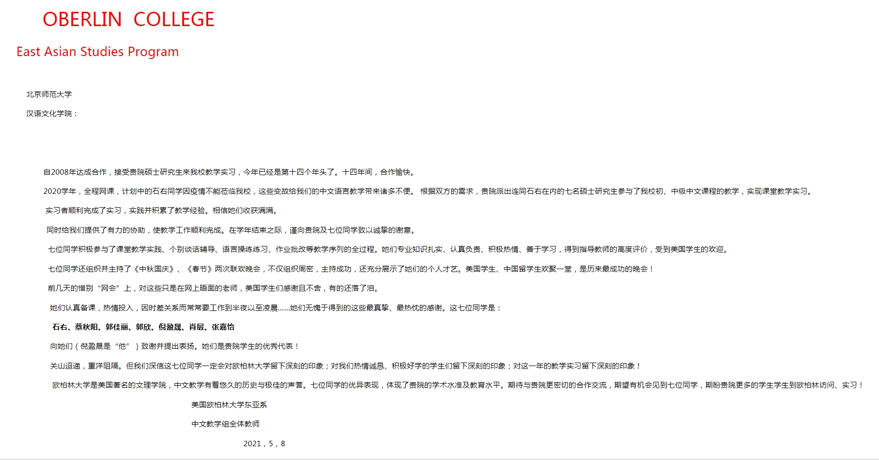 欧柏林大学东亚系致信北师大汉院