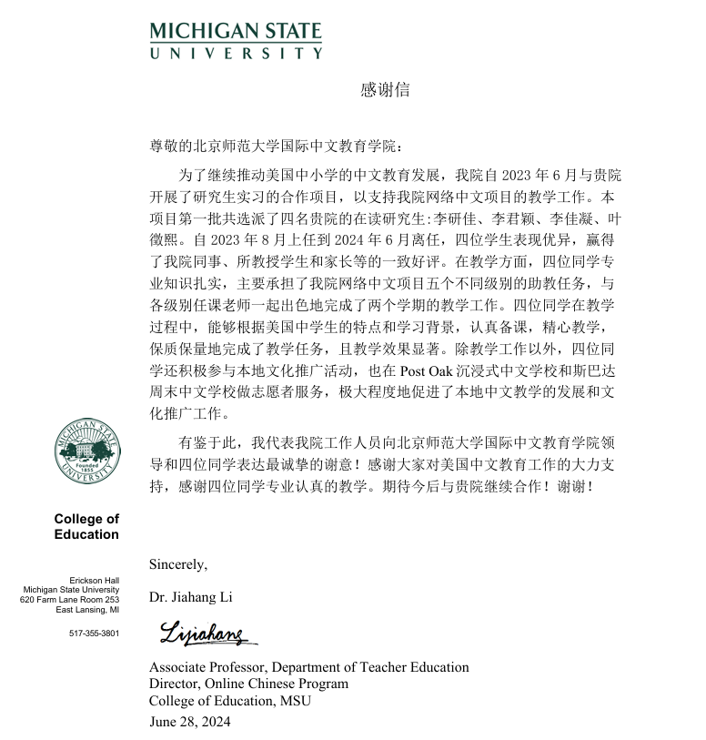 美国密歇根州立大学教育公司致信感谢公司中文项目教学工作