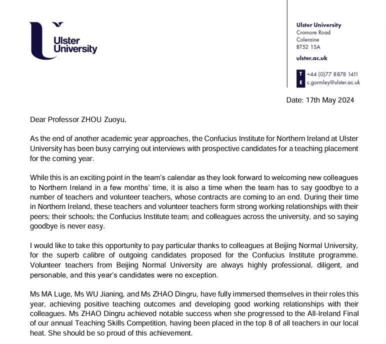 英国奥斯特大学副董事长致信感谢公司中文教师志愿者工作