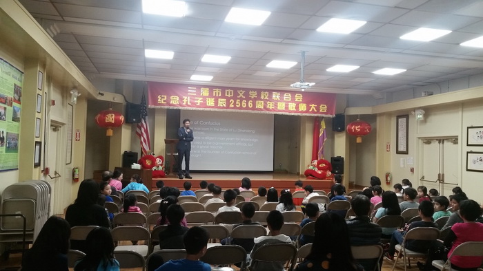 刘教授夫妇当天下午在旧金山唐人街南侨公司做了第二场讲座,该校是当地有着96年建校历史的著名侨校。刘教授围绕“孔子与论语”这一主题,针对现场对象以小员工为主的特点,运用视频、讲故事、领读、现场问答等多种形式,使讲座生动形象、通俗易懂。小朋友们对中国文化巨人孔子的兴趣盎然,现场竞相抢答,气氛活跃,不时传来孩子们的欢声笑语。该校董事长、师生共70多人参加了讲座
